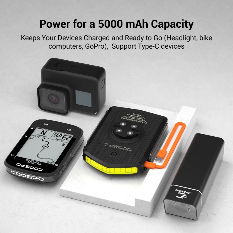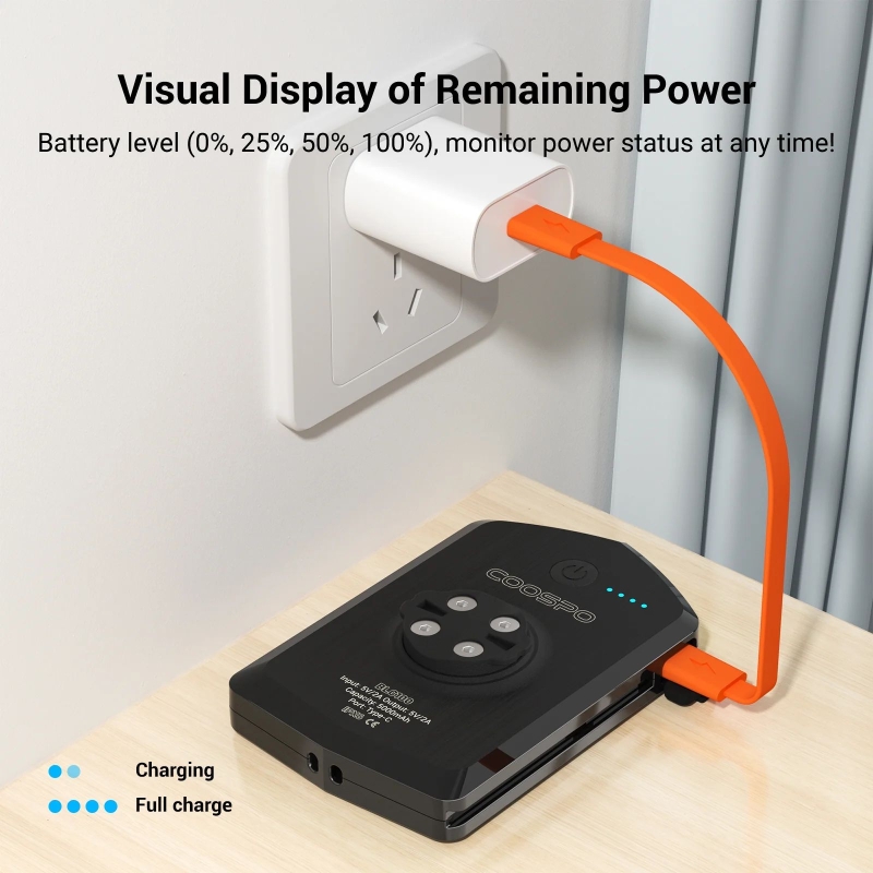 Fuente de luz de respaldo inteligente: Un breve toque te permite ver el nivel de batería restante. Su batería integrada ofrece suficiente energía para dispositivos como computadoras de bicicleta, cámaras GoPro, teléfonos o iPads, prolongando el tiempo para grabar esos momentos únicos en tu viaje.