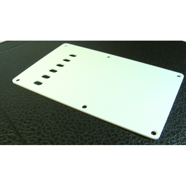 Cubierta trasera de plástico blanco en terminado brillante, tradicional en las guitarras Stratocaster y en otras de su tipo. Está diseñada para cubrir la cavidad donde se aloja el trémolo.