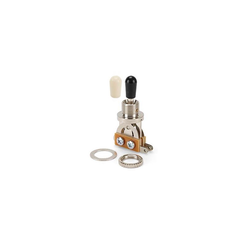 Selector cromado de poste corto 3 pasos (toggle), para guitarras con dos pastillas. De rosca métrica, muy usual en guitarras Epiphone Les Paul y otras de su tipo. Su construcción es robusta y su funcionamiento es suave y preciso. Muy confiable.