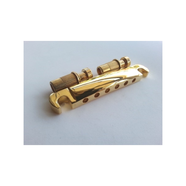 Tiracuerdas (Tailpiece) estilo manufacturado con materiales sólidos y muy durables. Su terminado es dorado brillante fino. La distancia de entrepostes es de 81.8 mm de mitad a mitad de las ranuras sujeta postes. Para guitarras Les paul Epiphone y otras de su tipo. Incluye postes y sockets para su instalación.