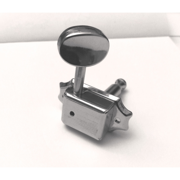Clavija cromada tipo vintage, muy usual en guitarras Fender y otras de su tipo. El botón es oval. Práctico reemplazo para la clavija que ya no mantiene la entonación. UNA Pieza nueva, no usada.