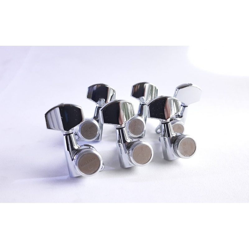 No más desafinadas !!. Producto del fino maquinado y pulido de la casa japonesa Gotoh, está maquinaria se considera entre las mejores disponibles. Cuenta con clavijas grandes estilo schaller muy usadas en guitarras modernas. De clavijas removibles y encasillado de acero forjado y lubricado sellado. Para guitarras con cabezales 3+3. Incluye tornillos para su instalación.