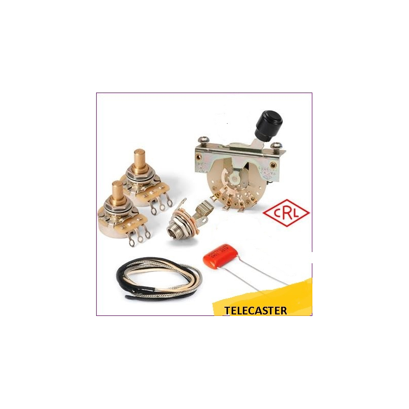 El KIT TELECASTER (y para otras guitarras de su tipo) incluye: 2 potenciometros CTS , un selector 3 PASOS marca CRL o Fender, un jack Switchcraft o FB (Japon) , un capacitor Orange Drop y Cableado de Circuito Vintage forrado de tela/blindado trenzado.