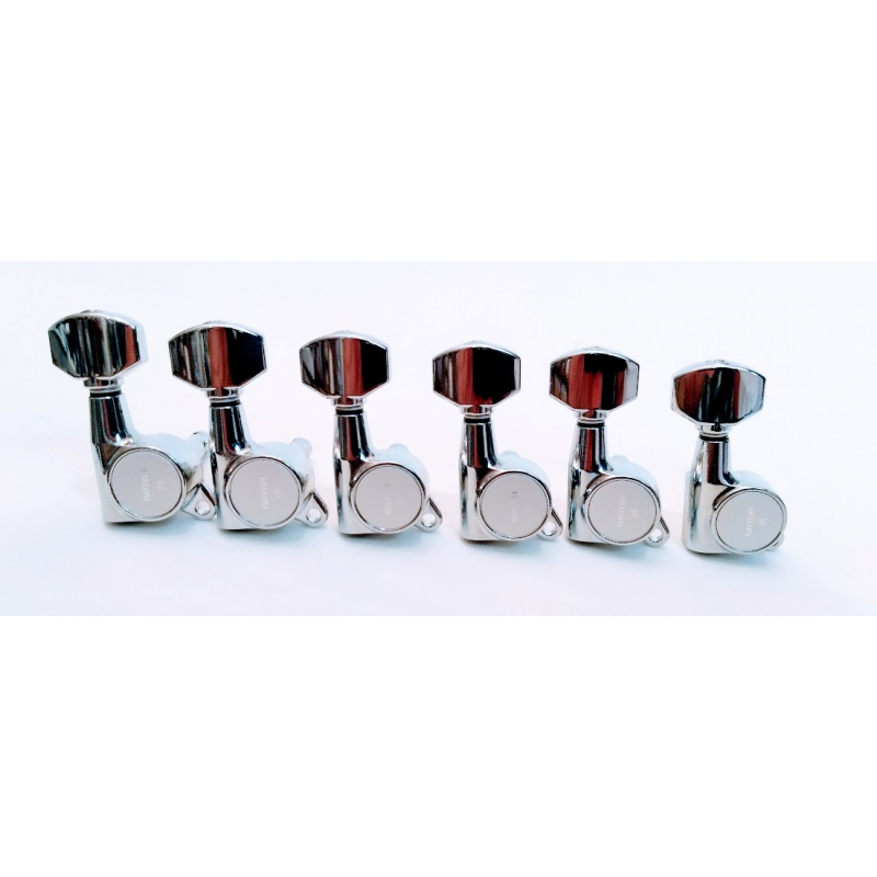 No más desafinadas !!. Producto marca Gotoh de fino maquinado y pulido en color Cromado. Esta maquinaria con candado cuenta con clavijas estilo Schaller muy usadas en guitarras modernas. De clavijas removibles y encasillado de acero forjado y lubricado sellado. Para guitarras con cabezales 6 en Línea. Incluye tornillos para su instalación.