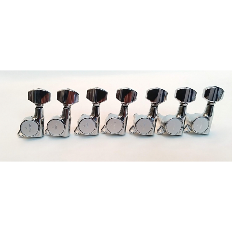 No más desafinadas !!. Producto marca Gotoh de fino maquinado y pulido en color Cromado. Esta maquinaria IZQUIERDA 7 en linea cuenta con clavijas estilo Schaller muy usadas en guitarras modernas. De clavijas removibles y encasillado de acero forjado y lubricado sellado. Para guitarras izquierdda o con clavijas 7 abajo. Incluye tornillos para su instalación.