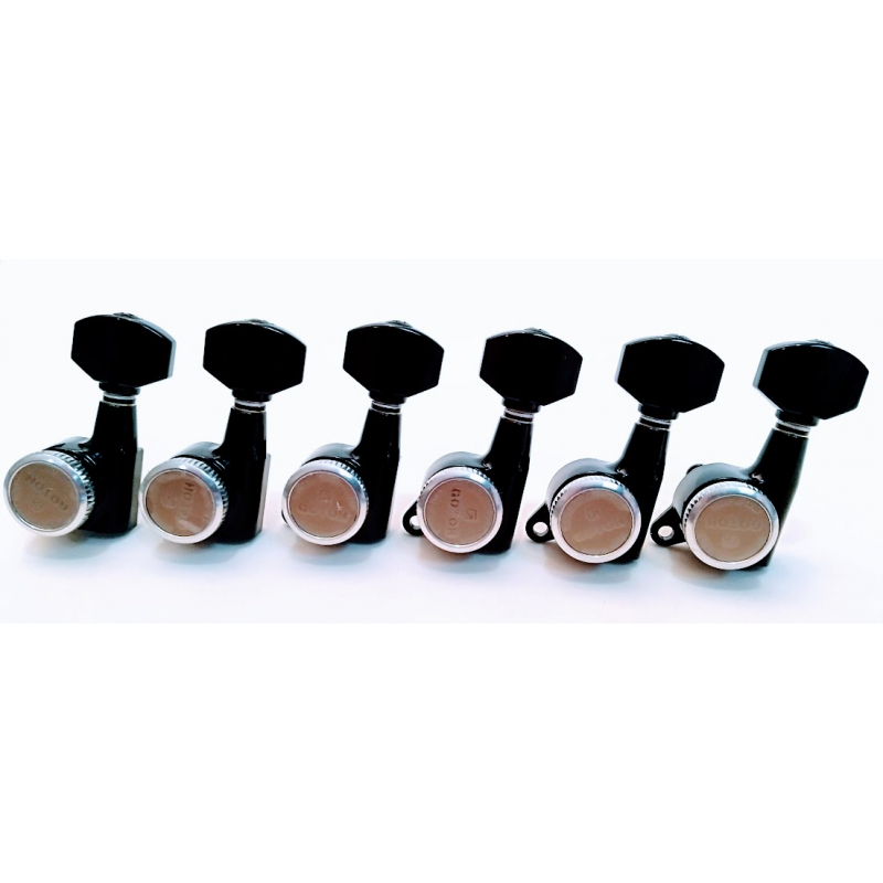 Maquinaria  Gotoh Magnum lock izquierda con candado y de clavijas grandes estilo schaller muy usadas en guitarras modernas. Los botones son removibles y el casillero es de cero forjado y lubricado sellado.  Para guitarras izquierdas o clavijas hacia abajo,  6 en Línea. Incluye tornillos para su instalación.