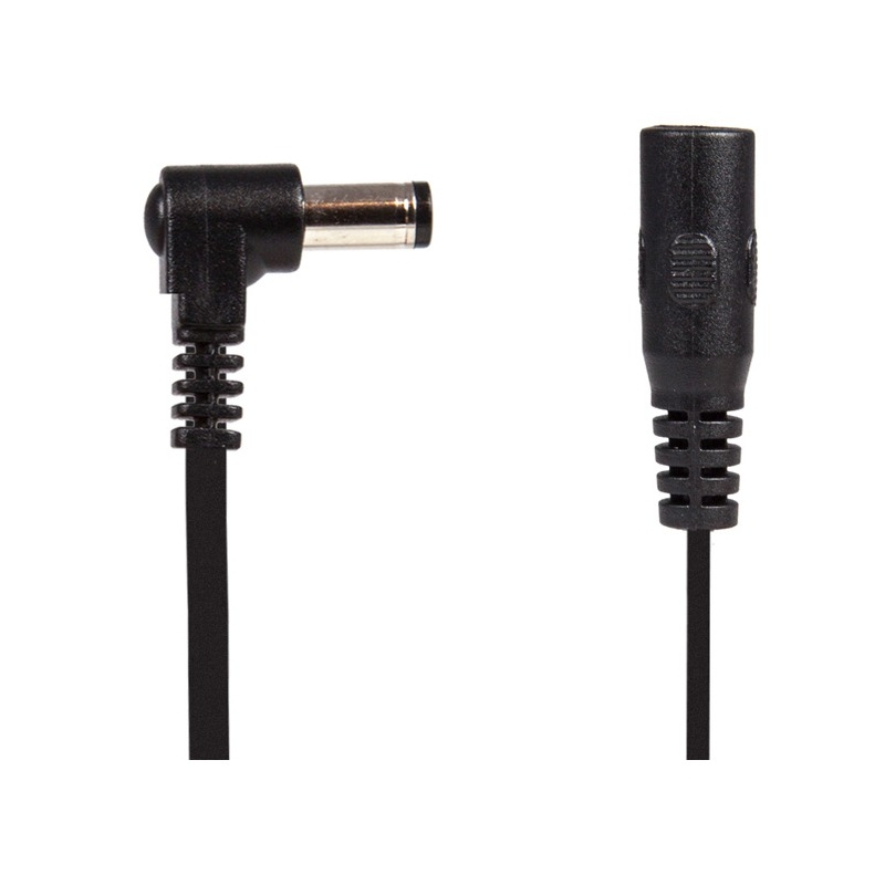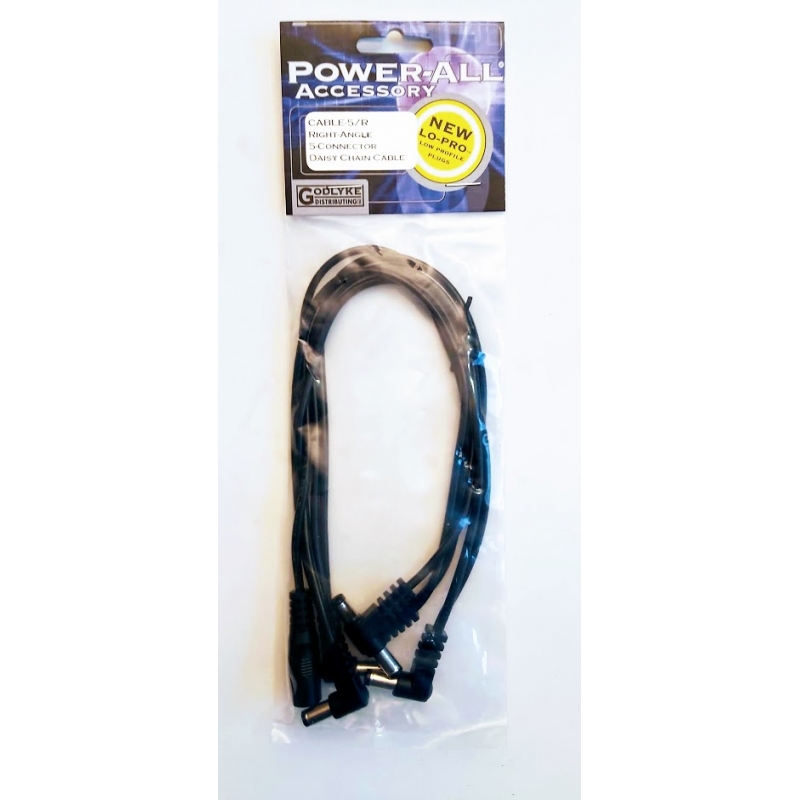Conector uso rudo Daisy Chain marca Power All de angulo recto con polaridad estandar --Punta negativa/Barril positivo-- . de diámetro exterior 5.5m , 2.2mm de diámetro interno y 10m de barril del plug. Cada cable mide 27cm entre jacks. El jack cuenta con un resorte para evitar que se desconecte.