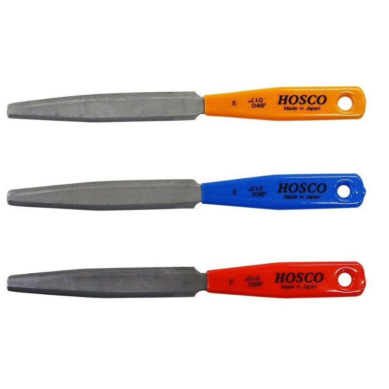 Set de 3 Limas hechas en Japón para trabajar Cejillas (nuts)  de Guitarras y  Bajos eléctricos. Cada Lima cuenta con dos lados que son de distinta medida. En total son 6 medidas:  (.010″/.026″, .013″/.036″, .017″/.046″)  El largo total de cada lima es 190mm y el largo de la hoja es de 100mm.