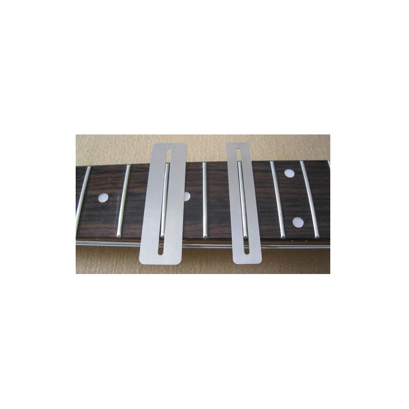Set de 2 Plantillas metálicas reutilizables para proteger el diapásón en cualquier tipo de trabajo con los trastes de la Guitarra, Bajo y otros instrumentos de cuerda. Hechos de acero inoxidable, son de .010" de grosor de tal manera que se pueden doblar para acomar a cualquier radio del brazo.