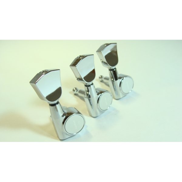 Producto del fino maquinado y pulido de la casa japonesa Gotoh, esta maquinaria es una de las mejores disponibles. Cuenta con clavijas estilo Tulipán que se utilizan en muchas guitarras modernas tipo Les Paul y 335. Para guitarras con cabezales 3+3, removibles, esta maquinaria tiene encasillado de acero forjado y lubricado sellado. Requiere hoyos de 13/32" de diámetro.Incluye tornillos.