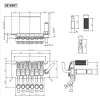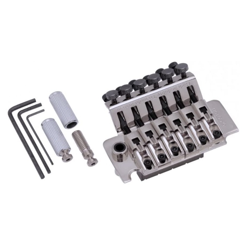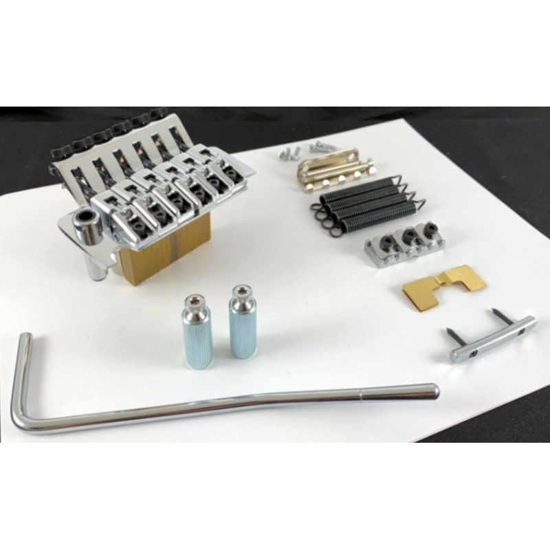 Floyd Rose fabricado por Gotoh bajo licencia. Modelo GE1996T. Las monturas están elaboradas en acero con un radio de 350mm. La distancia entre cuerdas es de 10.8mm. El bloque es de 36 mm de altura. La cejilla candado es de 43mm con atornillada por arriba del brazo. Si necesitas otra medida contáctanos. El acabado es magnífico, finamente pulido sea en color Cromado, Negro o Dorado.. El set es completo e incluye todo lo necesario para su instalación.