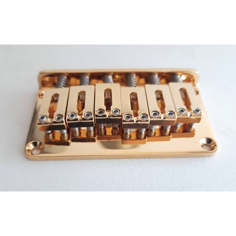 Puente Cromado Hard Tail (sin Trémolo) marca Gotoh para Guitarras Stratocaster y Telecaster y otras de su tipo. Terminado en color Dorado Pulido Fino, con monturas de acero. Incluye Tornillos para su instalación y Llave Alen para la entonación. Distancia entre cuerdas10.5MM