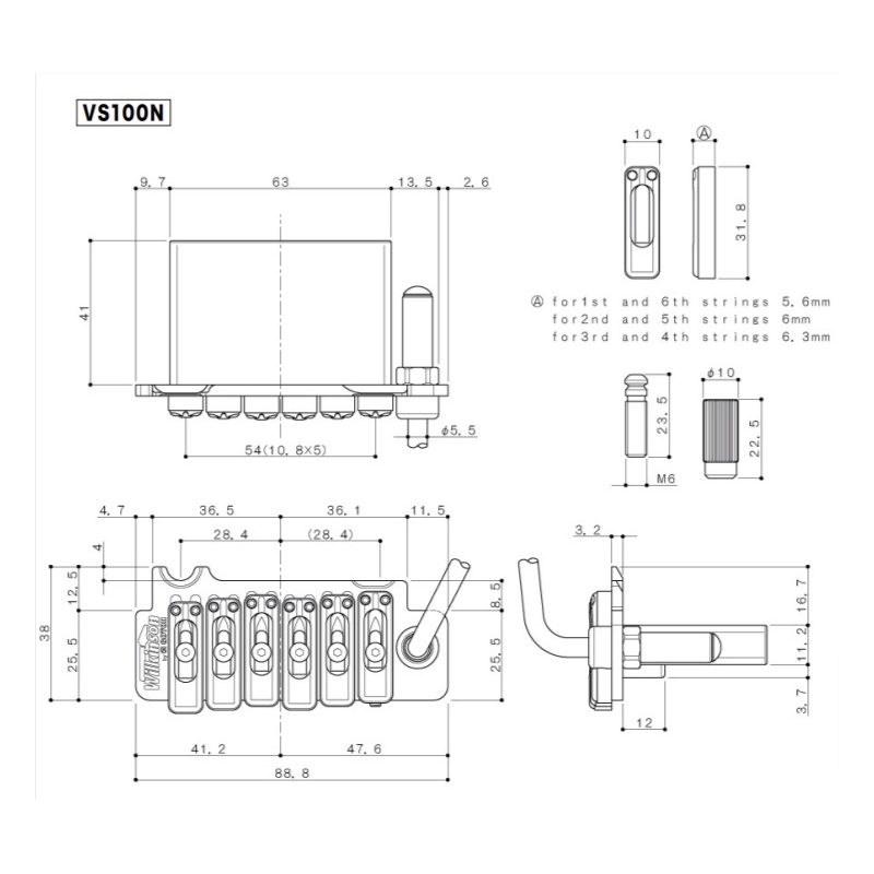 Modelos Premium VS100N de Puente Wilkinson hecho en Japón por Gotoh en color Negro Satinado. De 2 pivotes (2 postes). La placa base está hecha con acero endurecido, con el sistema de postes patentado Stud Lock. Las monturas corren po la placa con alinecación precisa y gran estabilidad. La distancia entre postes es de 2 3/16" (56.8mm). La distancia entre 2 cuerdas es de 10.8mm. Ver la gráfica anexa para las medidas del set.