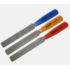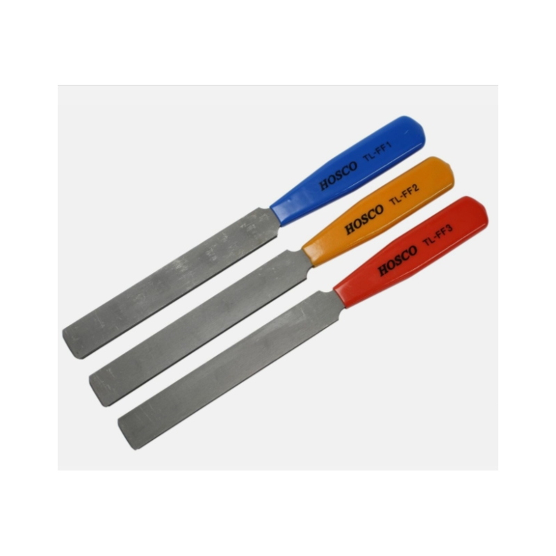 Set de 3 limas hechas por Hosco de Japón, modelos TL-FF1. TL-FF2 y TL-FF3. Para trabajos de afinado de corona de trastes de guitarras o bajos. 3 limas con doble lado para trastes de tamaño diferente: pequeño, medio y grande. Fabricadas en acero de alta calidad, garantizan una duración por años. Incluye estuche de plastico para guardalas.